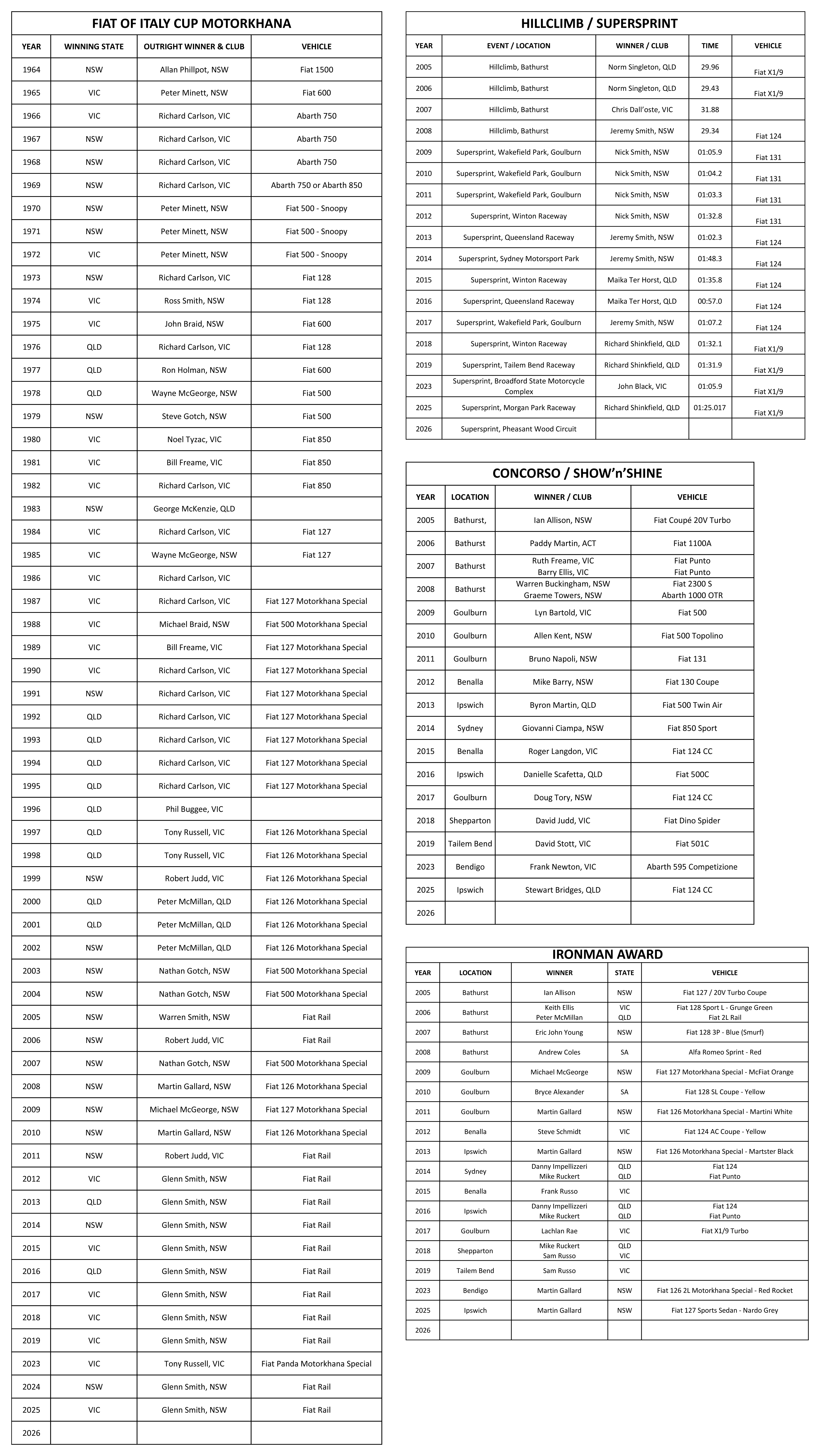 Since 1964 the Fiat Car Clubs of Australia have held an annual national competition and social gathering to celebrate their passion for the Fiat automobile.